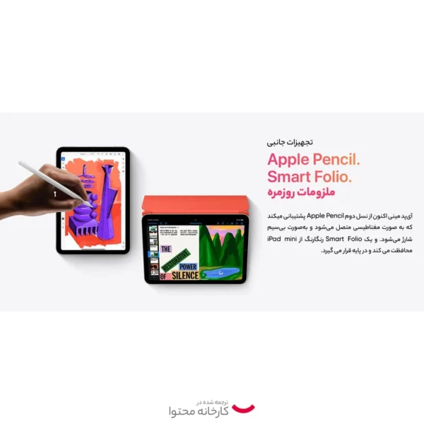در 14 سپتامبر 2021 شرکت اپل برای اولین بار از یک آیپد جدید با ابعادی کوچکتر رونمایی کرد. آیپد مینی 2021 در 4 رنگ بسیار زیبا و خاص بنفش، خاکستری، رز گلد و گلد تولید شده است. آیپد مینی 2021 اپل دارای صفحه نمایش 8.3 اینچی لیکوئید رتینا است. طراحی نمایشگر تمام صفحه با کمترین حاشیه و به اصطلاح All Screen این امکان را به شما میدهد تا تصاویری خارقالعاده با طیف رنگی گسترده P3 را در صفحه آیپد مینی 8.3 اینچی 2021 به صورت کاملاً واضح، قابل لمس و شبیه به واقعیت ببینید. برای این مدل یک سنسور اثرانگشت در کناره قاب آیپد تعبیه شده است که علاوه بر تضمین امنیت آیپد شما از سرعت بسیار بالایی برخوردار است. تراشه A15 بایونیک، دارای سی پی یوی 40% سریعتر، گرافیک 80% قویتر نسبت به نسل گذشته است که تاکنون تولید و روانه بازار شدهاند. آیپدمینی 2021 دارای یک کانکتور (USB-C) با پشتیبانی از DisplayPort است که میتوانید به وسیله آن انواع لوازم جانبی و اکسسوری های مختلف از جمله دوربین ها، نمایشگر ها و بسیاری از موارد دیگر را به راحتی و بدون دردسر به آن متصل کنید.
