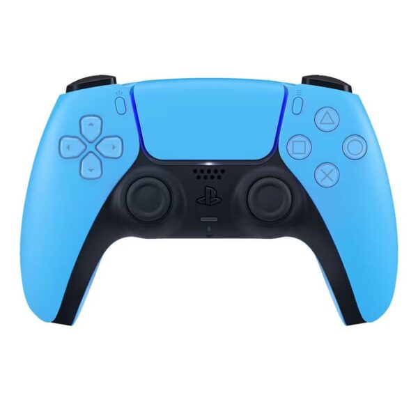 این دسته با رنگ ابی و جزئیات مشکی، ظاهری مینیمال دارد که بلافاصله توجه کاربران را به خود جلب میکند. استفاده از نورپردازی LED در اطراف تاچ پد جلوهای زیبا و مدرن را به این دسته بخشیده و هماهنگی مناسبی با کنسول PS5 ایجاد کرده است. ارگونومی و راحتی در طراحی DUALSENSE بهصورت کامل موردتوجه قرارگرفته است. دستهها با انحنای ملایم و بافت مات خود حس خوشایندی را به کاربران در هنگام کار با آن منتقل میکنند و از ایجاد لغزش در طول بازی جلوگیری میکنند. اندازه و وزن مناسب این دسته باعث شده تا در طولانیمدت دستها احساس خستگی نکنند. دکمههای این دسته نیز در فاصله مناسبی از هم قرارگرفتهاند تا دسترسی به آنها برای بازیکنان راحت و سریع باشد. در قسمت جلویی دسته، تاچ پد بزرگ و دکمههای PS، Share و Options قرار دارند. جویاستیکها با دقت بالا و حساسیت مناسب حرکات دقیق و روانی را فراهم میکنند.